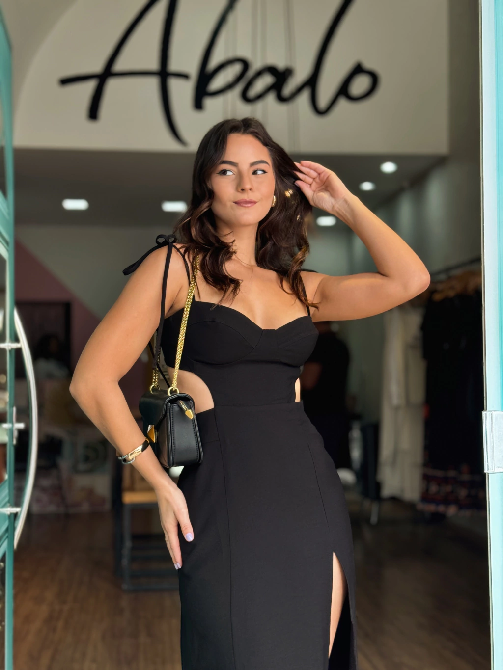 Vestido com fenda frontal, o decote do busto em meia taça com elástico nas costas para ajuste e amarração no ombro.